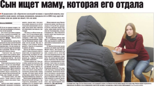 В январе 2017 года в «Диапазон» обратился молодой человек с просьбой помочь ему найти маму, которая в 1993 году оставила его в роддоме («Диапазон» от 01.02.2017 «Сын ищет маму, которая его отдала 23 года назад»). В 16 лет во время ссоры с тетей Артур узнал, что он не родной. С того момента молодой человек обращался во все инстанции, в газету и ему удалось найти родную мать.