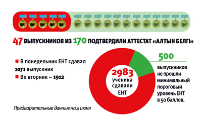 – В этом году в тестах стало больше логических вопросов. По математике, географии, химии и биологии появились схемы и диаграммы, – рассказывает руководитель отдела дошкольного и общешкольного среднего образования облУО Гульжан Кулыбекова. – Результаты ЕНТ учащиеся узнают вечером того же дня, не согласные с ними могут подать апелляцию на следующий день.