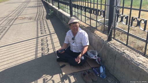 На фото: 8 июля. 54-летний Курманов приковал себя цепью к забору областной прокуратуры. || Фото «Азаттык»