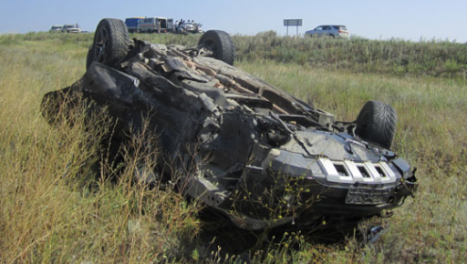 На хромтауской трассе 1 августа около 15 часов столкнулись лоб в лоб автомобили «Мерседес» и «Мазда». Первая иномарка от удара вылетела с трассы, перевернулась несколько раз и приземлилась на крышу в нескольких десятках метров от места столкновения.