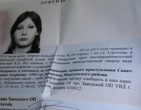 Удалось выяснить, что главной подозреваемой по делу проходит 20-летняя уроженка села Полтавка Мартукского района Виктория Савич и ее молодой человек Сергей, ему 21 год, он из Актобе, по специальности программист. Девушка работала в букмекерской конторе BET Club. На ее личной страничке в соцсети указано, что она является студенткой ААЭС. В своих первоначальных показаниях Савич рассказала, что после очередной ссоры с парнем тот попросил «найти для него девственницу». Девушка познакомилась со школьницей Гульдирой Сакеновой через соцсеть «агент». Через некоторое время пригласила ее в гости. 8 октября Гульдира пошла к ней домой. Своего молодого человека Савич представила Гульдире как брата. Школьница осталась у молодых людей на ночь. Утром девушка приревновала своего молодого человека к школьнице и задушила ее проводом зарядки от сотового телефона.