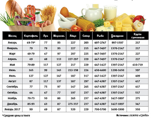 Самый высокий скачок цены произошел на гречку. Если в январе 2016 года килограмм гречихи стоил 217 тенге, то уже в мае достиг 719 тенге. После этого гречка снова стала падать в цене и к январю 2017 г. достигла 299 тенге. Более чем на 100% подорожала рыба. В январе цена на килограмм рыбы, в зависимости от разновидности, составляла от 497 до 2767 тенге. К концу года это соотношение выросло до 647-4387 тенге.
