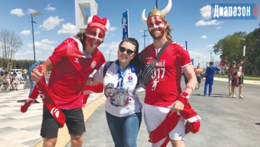 На фото: На фото с волонтером из Актобе болельщики из Дании. || Фото Алины ВАЛИЕВОЙ