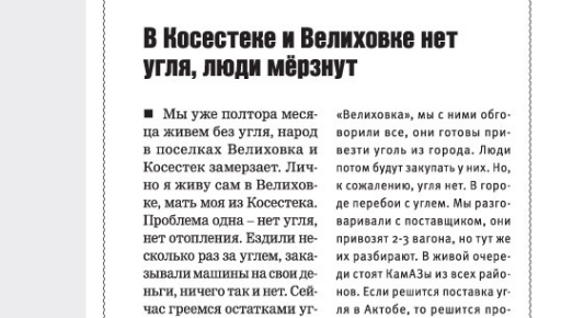 Живу в селе Косестек Каргалинского района. С августа в поселке рабочие копали, собирались провести газ. Обещали, что у нас в домах он появится не раньше 2017 года. В последнее время с углем были проблемы. Люди занимали уголь в долг. Привезли как-то одну тонну, но разве этого хватит? Мы на всю зиму закупали 5-6 тонн за 15 тысяч тенге. И ждали, когда нам подадут тепло. У нас примерно 2 тысячи жителей, было больше, но сейчас даже в школе детей мало. Многие уехали отсюда больше 20 лет назад.