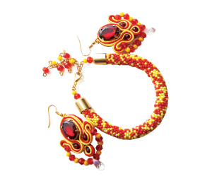 Изысканные сутажные серьги с ярко-красным кристаллом и жгут-браслет из бисера от рукодельницы Асель Жубанышевой притягивают к себе внимание и подойдут яркой девушке.