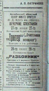 29 июня Актюбинский театр юного зрителя выезжает на станцию Алга, где даст 12 спектаклей для рабочих «Актюбхимстроя» и их детей.