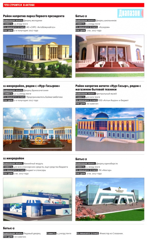 Рядом с бассейном в Батысе-2 строится Дворец школьников. Сдать его планируют в 1-м квартале 2017 года. Спонсор «Казхром». Там же, в Батысе-2 «Нектар» начал строить Дворец единоборств (Дворец спорта) на 1500 зрительских мест. В Актобе не было залов для международных или республиканских соревнований. Еще начнем строить Ледовый дворец [фото его в акимате предоставить не смогли. Проект находится на утверждении. – Ред.]. Этим на основе государственно-частного партнерства будет заниматься словацкая компания.