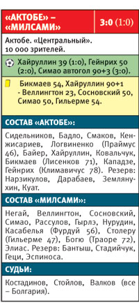 В ответном матче второго квалификационного раунда Лиги Европы актюбинцы победили со счётом 3:0 оргеевский «Милсами». Героем встречи стал Марат Хайруллин, который забил сам и отдал две голевые передачи.