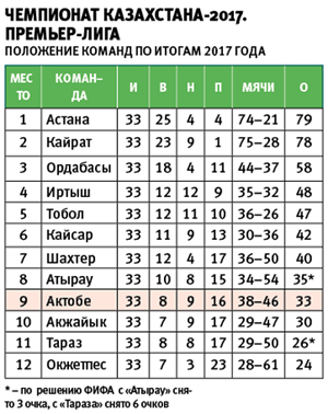 В последнем туре чемпионата-2017 «красно-белые» пытались помешать «Кайрату» стать чемпионом. Попытка не удалась, но алматинский клуб всё равно не выиграл титул. Для «Актобе» сезон закончился в октябре, когда одолели «Ордабасы» дома и избежали вылета в первую лигу.