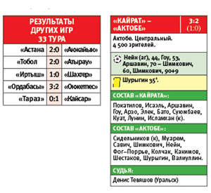 В итоге 3:2, «Кайрат» становится серебряным призером чемпионата, а «Актобе» завершает сезон на 9-м месте. Поражение в последнем матче сезона стало 16-м в чемпионате-2017. Такого показателя у «красно-белых» не было с 1997 года, когда по итогам сезона в 26 матчах было 19 поражений.