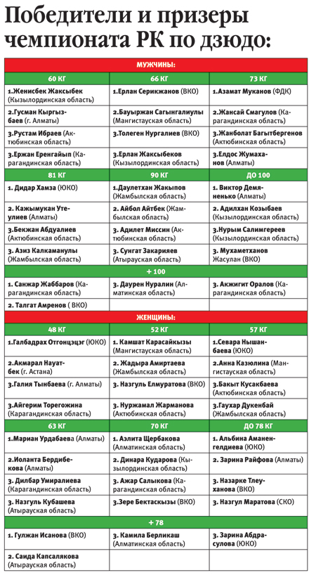 Представлявшие Актюбинскую область дзюдоисты взяли 6 медалей – все бронзовые. Сначала первую медаль принесла Нуржамал Жарманова в весовой категории 52 кг. Затем за бронзу зацепились проигравшие в полуфиналах Рустам Ибраев, Жанболат Багытбергенов, Бекжан Абдуалиев, Адилет Миссин и Бакыт Кусакбаева.