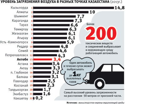 – Раз в месяц лаборатория центра санэпидэкспертиз отбирает пробы воздуха в 22 точках города, – говорит замруководителя городского санэпиднадзора Айсауле Уралбаева. – Всего по 37 показателям, среди которых составные выхлопных газов, фенол, свинец, 6-валентный хром, сероводород и бензол. ПДК по сероводороду, взвешенным веществам (пыли), диоксиду серы, азота (составляющим выхлопов) превышают в городе в 1,3-1,5 раза. Большой ущерб атмосферному воздуху наносит транспорт. Работающий автомобиль выбрасывает в окружающую среду более 200 токсических веществ и соединений. Эти проблемы мы выносили на сессию гормаслихата. Решили, что в городе будут сажать деревья, улицы, где самый большой поток транспорта, хотя бы раз в день поливать и необходимо благоустраивать санитарно-защитную зону промпредприятий.
