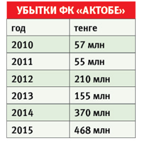 После этого глава региона озвучил убытки «Актобе». В 2010 году убытки составляли 57 млн, в 2015 году – 468 млн.