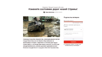 «Уважаемый Нурсултан Абишевич! Просим обратить внимание на чрезвычайную ситуацию с аварийным состоянием дорог нашей страны. Дороги у нас всегда были низкого качества, но в 2016 году ситуация критическая: огромные ямы, отсутствие разметки препятствуют передвижению. В одном только Актобе в соцсетях сотни фото и видео с провалившимися в ямы на дорогах машинами. Повсюду валяются куски бамперов и подкрыльников от машин. Ремонт практически не проводится, даже не ограждаются опасные участки дорог. Основные причины, которые препятствуют восстановлению покрытия дорог и тротуаров, как считают наши жители, это: