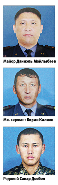 На фото: Даниэль Майлыбаев, Берик Калиев и Сапар Досбол погибли при нападении террористов на войсковую часть. Двое из них были безоружны. Когда пройдет следствие, всех троих представят к награде посмертно. || Фото Владимира ЗОБЕНКО
