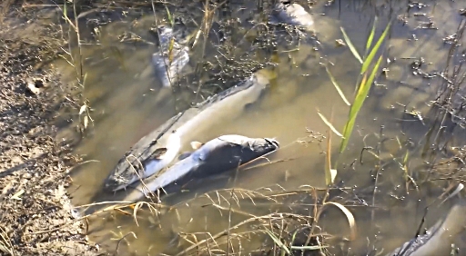 На берегу и в воде тысячи мёртвых карасей, сомов, щук и раков. Причина массовой гибели рыбы ещё неизвестна. Местные жители говорят, что рыба начала дохнуть после сильных дождей в конце июля, возможно в воду попали химикаты с полей. Специалисты пока не могут сказать, почему в некогда чистой реке гибнет фауна.