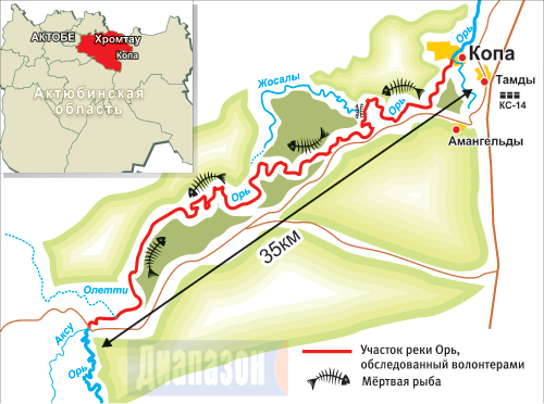 4 августа из Хромтауского района пришло тревожное известие: вблизи поселка Копа в реке Орь погибла рыба. Вода на участке несколько десятков километров почернела, на поверхности масляные пятна, пена, на берегу и в воде сотни погибших карасей, сомов, щук, раков. Рыбаки назвали это экологической катастрофой. 10 августа в инспекции лесного хозяйства и животного мира «Д» сообщили, что мор в реке прекратился. 11 августа на реку Орь выехали корреспонденты «Д». Проехали больше 200 километров в одну сторону к руслу реки около поселка Тамды Хромтауского района. Дальше двигаться на легковой машине было уже невозможно.