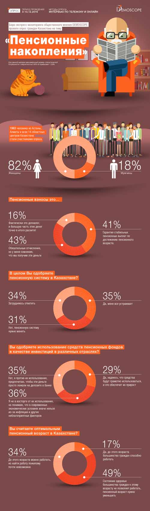 При этом суть накопительной пенсионной системы в Казахстане одобряют 35% участников опроса. Немногим менее (31%) противоположны во мнении и считают, что пенсионную систему необходимо менять, так как действующая модель себя не оправдывает. Еще 34% вообще затруднились с ответом.