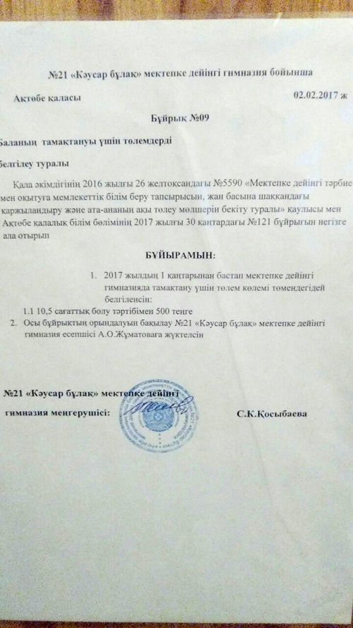Постановление акимата города о повышении родительских взносов вышло 26 декабря 2016 года, 30 января горОО издал свой приказ. В нем говорится, что 500 тенге за садик родителям надо платить с 1 января. Дело в том, что постановление акимата в органах юстиции зарегистрировали только в конце января. Мы свой приказ издавали после этого. Но поскольку месяц уже прошел, решено оплату 500 тенге взимать с 1 февраля. Во всех садиках провели собрания, родителям все объяснили».