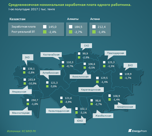 Сохранить и даже немного увеличить реальный уровень зарплат сумели только работодатели Актюбинской области: +0,8% за год. Номинальный рост составил +7,7%, до 121,28 тыс. тг по итогам полугодия.