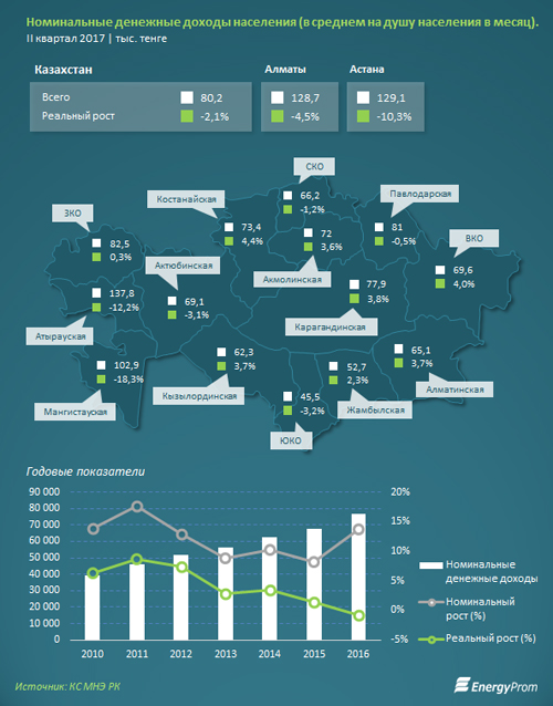 Самый высокий уровень доходов в Атырауской области (137,8 тыс. тг, с учетом инфляции - минус 12,2% за год) и Астане (129,1 тыс. тг, снижение покупательской способности на 10,3%).