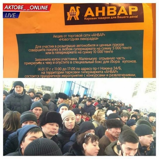 В субботу, 14 января, в одном из центров торговой сети "Анвар" в Актобе произошел скандал из-за новогоднего розыгрыша автомобиля Toyota Camry и других ценных призов.