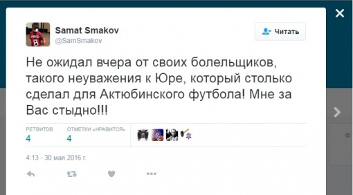 "Не ожидал вчера от своих болельщиков такого неуважения к Юре, который столько сделал для Актюбинского футбола! Мне за вас стыдно!!!" - написал в Twitter Самат Смаков.