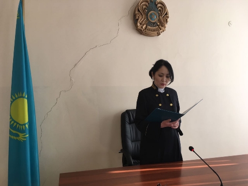 На фоне треснутой стены судебного помещения судья Айдана Мамбетказиева вынесла решение - в удовлетворении иска отказать. //Фото автора.