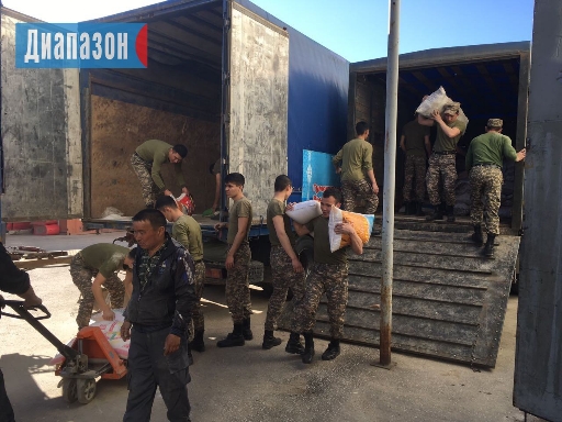 25 апреля. Актобе. Гуманитарную помощь для пострадавших из Кызылорды привезли на 7 КамАзах. //фото автора.
