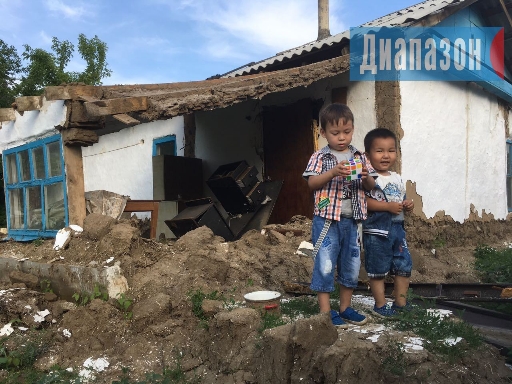 Разрушенный от паводка дом в Махамбетовке. Внуки Даны Темирбаевой, пострадавшей от потопа, играются во дворе. //Фото автора.