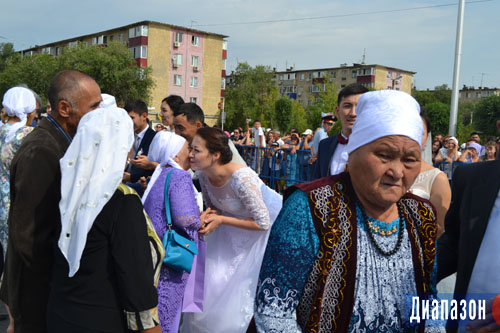 Секретами семейного счастья с молодоженами поделились 50 семейных пар, проживших вместе более 25 лет. В их числе и чета Бахита и Ольги Избасаровых, празднующие 65 - летие совместной жизни. Они вручили молодым символические подарки и дали слова напутствия. Молодожёны станцевали свадебный вальс и запустили в небо шары в форме сердец.