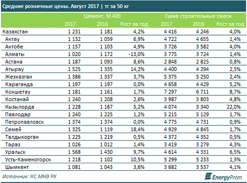 Параллельно с ростом спроса, растут и цены на стройматериалы. Так, по итогам августа цены на цемент марки прочности М 400 в Актобе выросли на 4,9%, а на сухие строительные смеси на 4 %.