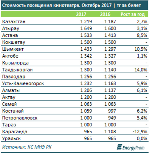 Также в стране на 2,7% подорожали билеты в кино. В Актобе средняя цена билетов выросла на 1,1 %, с 1327 до 1342 тенге.