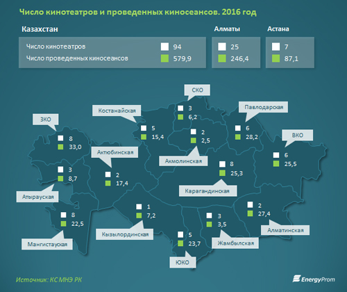 К началу этого года казахстанцам оказывали услуги 94 кинотеатра (в 2015 году 93). В прошлом году в них провели 579,9 тысячи киносеансов - на 11,5% больше, чем годом ранее.