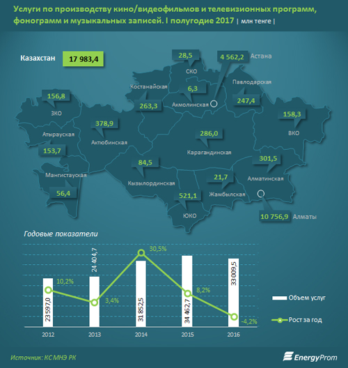 Всего за 2017 год объем услуг по производству кино, телепрограмм и музыкальных записей составил 18 миллиардов тенге - на 58,5% больше чем в прошлом году, передает energyprom.kz.
