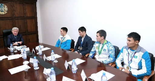 На встречу были приглашены Есет Куанов, завоевавший звание Чемпиона мира по самбо; Мейрамбек Айнагулов – серебряный призер Чемпионата мира по греко-римской борьбе в Париже; дзюдоист Рустам Ибраев, выигравший бронзовую медаль Всемирной Универсиады в китайском Тайбэе, и Амандык Асауулы - бронзовый призер Чемпионата мира по самбо в Сочи.