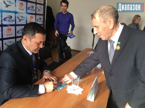 На фото: Александр Курбанов из школы юных летчиков в Актобе попросил космонавта дать автограф для лучших курсантов.