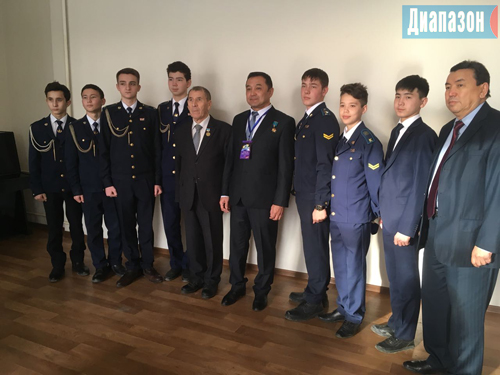 На фото: На встречу с Айымбетовым пришли курсанты школы юных летчиков. Космонавт сфотографировался с ними на память.