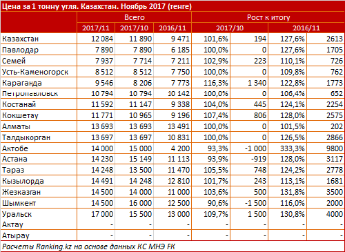 После прошлогоднего падения, на конец ноября этого года цена на уголь за год выросла сразу на 27,6%, до 12,0 тысяч тенге за тонну.