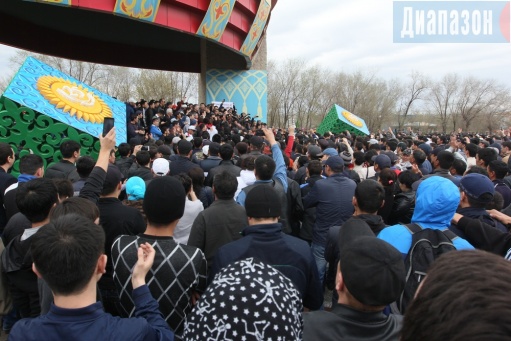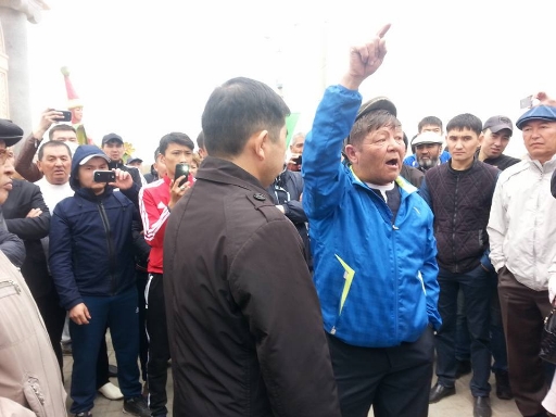 Люди выступают поочередно, желающие обратиться к согражданам выстраиваются на сцене. Здесь же на сцене позади выступающих стоят замакима области Аскар Шериязданов, аким города Бекбол Сагын, руководитель управления земельных отношений, прокурор.