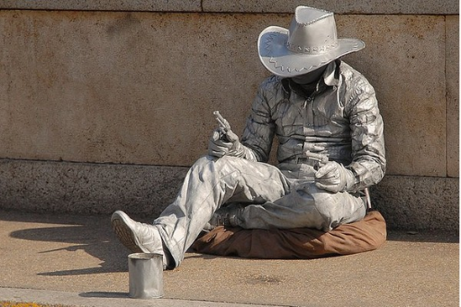 Артист изображал живую статую, наряженную в ковбойскую одежду и выкрашенную в серую краску. Зрители с удовольствием наблюдали, как неподвижный мужчина неожиданно протягивал руку и здоровался с прохожими.
