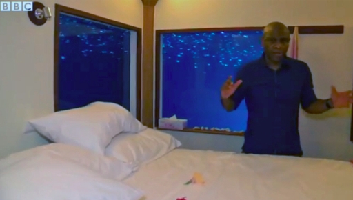 Спустившись вниз, Салим оказывается в уютной комнате с большими окнами на каждой стене. За толстыми стеклами косяками ходят рыбы всех цветов радуги. Кажется, что ночуешь в настоящем аквариуме. Стоимость проживания в столь необычном отеле, к сожалению, не уточняется.
