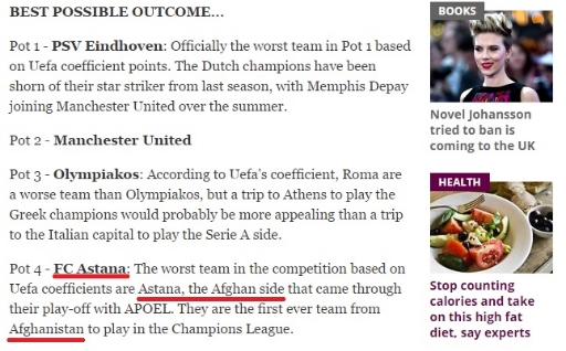 Известная британская газета Independent допустила ошибку в статье о жеребьевке группового этапа Лиги чемпионов УЕФА, назвав ФК "Астана" афганским клубом.