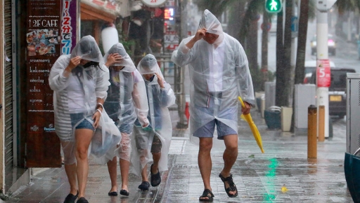 Сейчас тайфун движется в море к югу от Окинавы со скоростью 25 километров в час на северо-запад. Скорость ветра в центре тайфуна – 60 метров в секунду. Давление в центре тайфуна составляет 900 гектопаскалей.