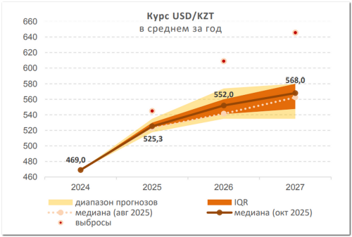 - 2025 год: 525,3 тенге за доллар (ранее 522,8);