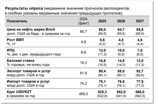 Центральным выводом опроса стало повышение медианных прогнозов по курсу доллара к тенге на весь горизонт планирования. Участники рынка ожидают ослабления национальной валюты на фоне снижения мировых цен на нефть.