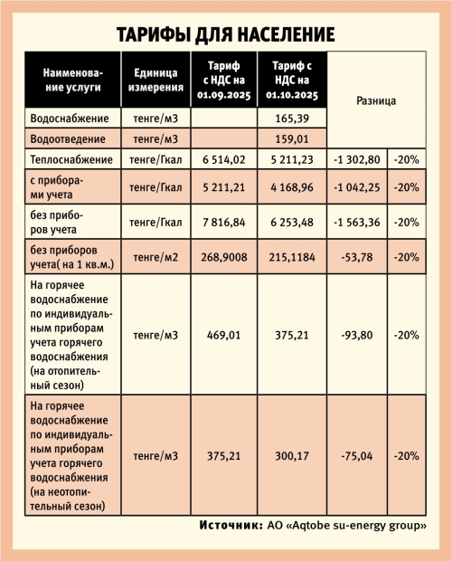 Как разъяснили в АО «Aqtobe su-energy group», по приказу департамента Комитета по регулированию естественных монополий по Актюбинской области, с 1 октября на 20% снижены тарифы на теплоснабжение и горячую воду для физических лиц. Заметим, что касается тепла, тариф на него поднимали этим летом дважды - в июле и сентябре, несмотря на это, в сравнении с прошлым отопительным сезоном плата за тепло будет значительно меньше.
