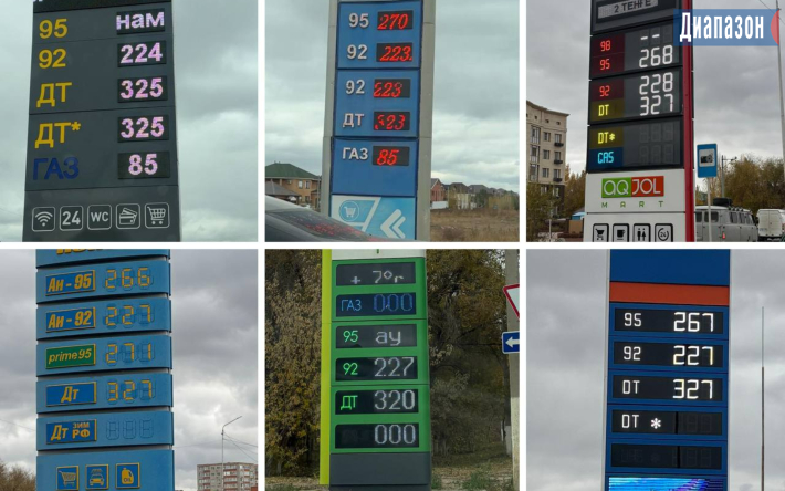 Министерство энергетики Республики Казахстан сообщает, что коридор цен на крупных сетях АЗС составляет от 213 до 239 тенге за литр АИ-92 и от 317 до 337 тенге за литр дизельного топлива.