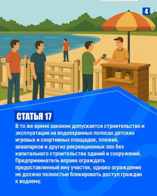 «В то же время законом допускается строительство и эксплуатация на водоохранных полосах детских игровых и спортивных площадок, пляжей, аквапарков и других рекреационных зон без капитального строительства зданий и сооружений. Предприниматель вправе ограждать предоставленный ему участок, однако ограждение не должно полностью блокировать доступ граждан к водоему», - уточнили в ведомстве.