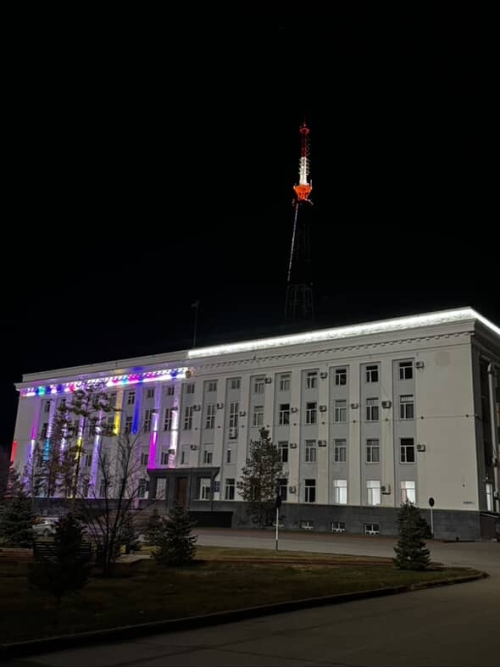 Своеобразная подсветка здания городского акимата и телевышки. Интересно, аким города в курсе?